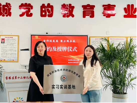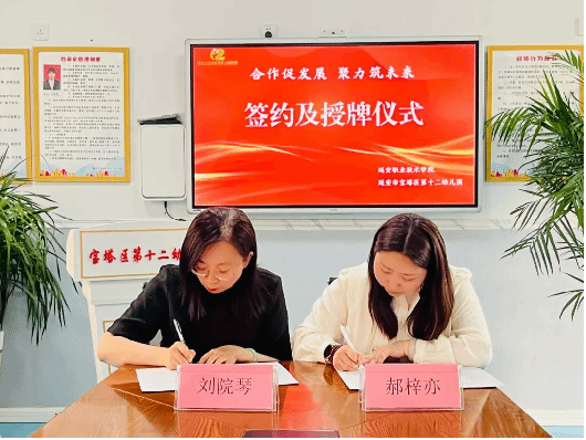 为加强学前教育专业建设,促进高校与幼儿园深度合作,拓展与夯实学前教育实习基地,实现合作共赢。2024年4月28日,延安职业技术学院师范教育系系主任刘院琴、副主任郭军权、教学科副科长张辉、专业教师恒梦娇与延安市宝塔区第十二幼儿园举行了“合作促发展,聚力助未来”实习基地签约暨授牌仪式。